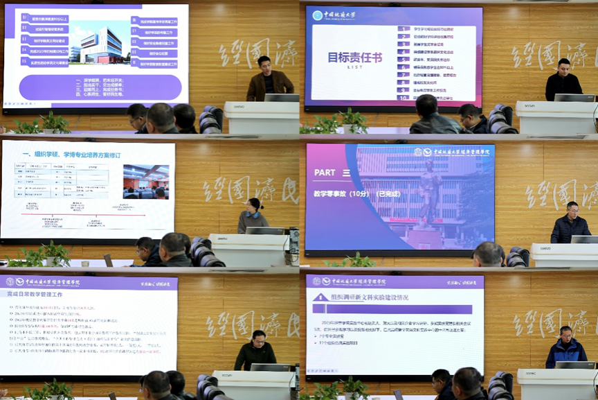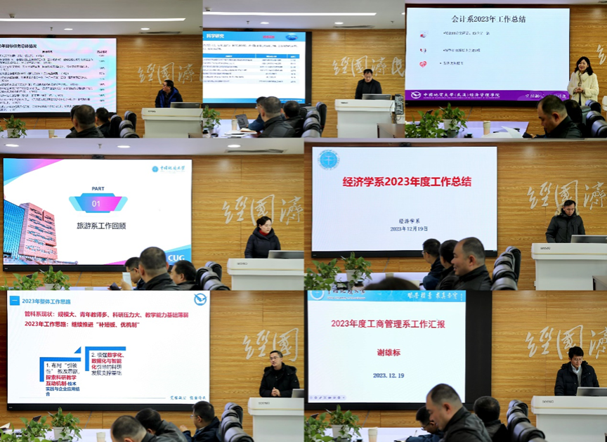 会上,统计学系、金融与贸易系、会计系、旅游管理系、经济学系、管理科学与工程系、工商管理系系主任分别从党建工作、教学、科研、人才引进、专业与学科建设等方面工作进展进行详细汇报,并分析了自身存在的问题和下一步工作思路。随后,sunbet综合事务办公室、研究生教育办公室、本科生教育办公室、德育工作组、专硕教育中心和实验教学中心科室负责人从2023年度目标工作责任完成情况、工作不足之处以及未来展望等方面作了工作汇报。